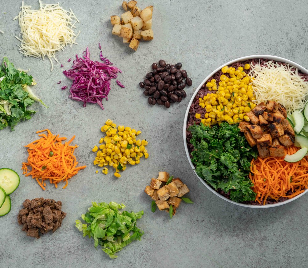 Fully customizable bowl with your choice of bases, toppings, and sauces