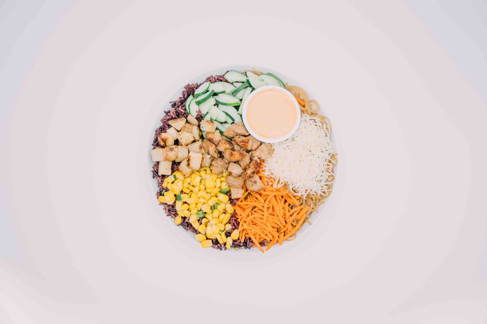 Fully customizable bowl with your choice of one protein, bases, toppings, and sauces.